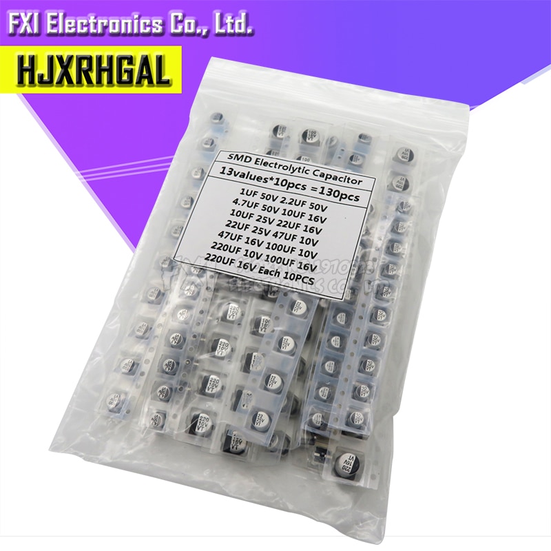 130pcs/LOT 1uF-220uF SMD Aluminum Electrolytic Capacitor Assorted Kit Set, 13values*10pcs=130pcs Samples Kit