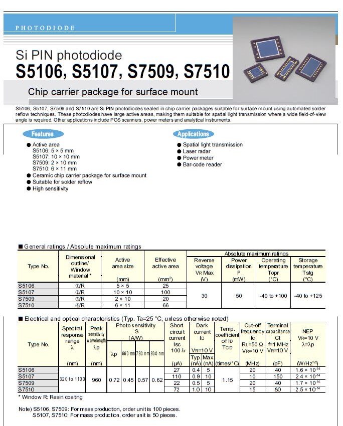 Brand Name: laez evaw Type: Modem Cable Package: Yes Model Number: none Products Status: STOCK   1PCS Hamamatsu Silicon PIN Photodiode Chip Package S5106 S5107 S7509 S7510