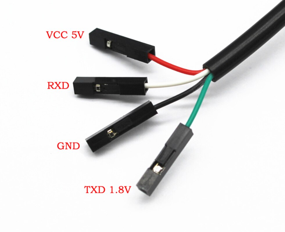 The default wire length is 1 meter, and there are 4 core wires inside, which are black, green, white, and red (corresponding to GND, TXD, RXD level 1.8V, 5V)