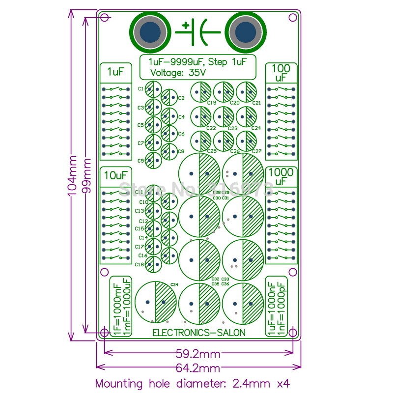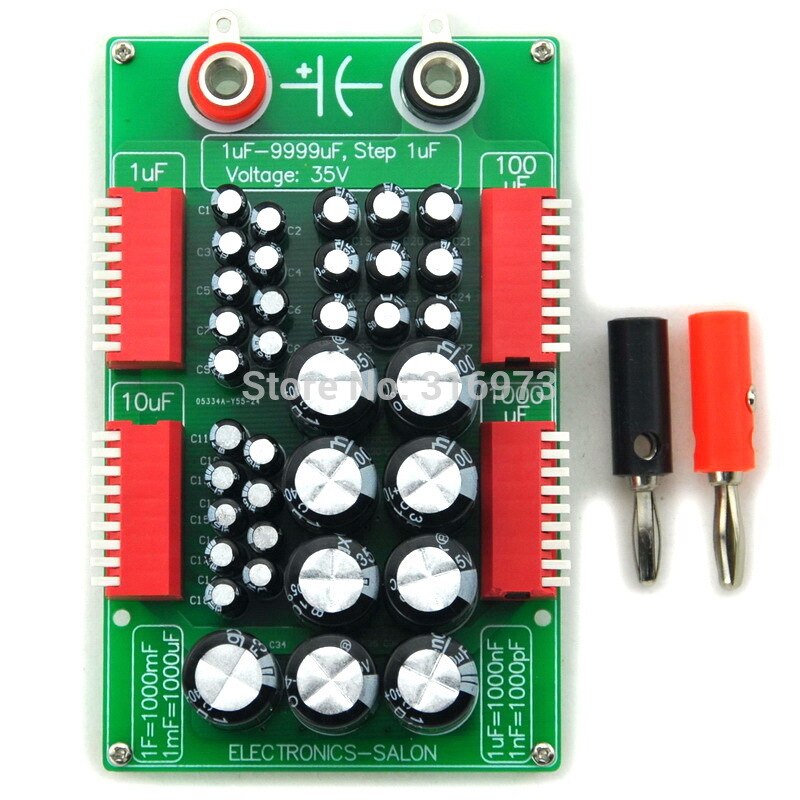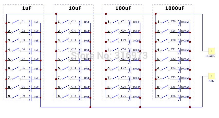 This is “capacitance substitution box” good low-cost alternative solution, can flexible and quick setting capacitance range from 1uF to 9999uF, step accuracy 1uF. for educational experiments, electronic engineering design or test trimming are excellent applications.