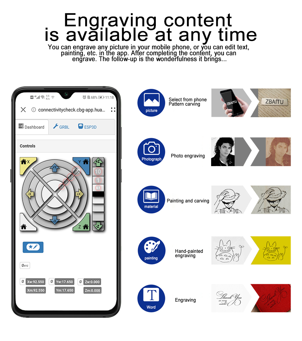 | This machine is compatible with a variety of mature engraving software, such as LaserGRBL, LightBurn, supports Win XP/Win 7/Win 8/XP/Win 10, also supports MAC system (LightBurn), the engraving file format supports NC, BMP, JPG, PNG, DXF, etc. |