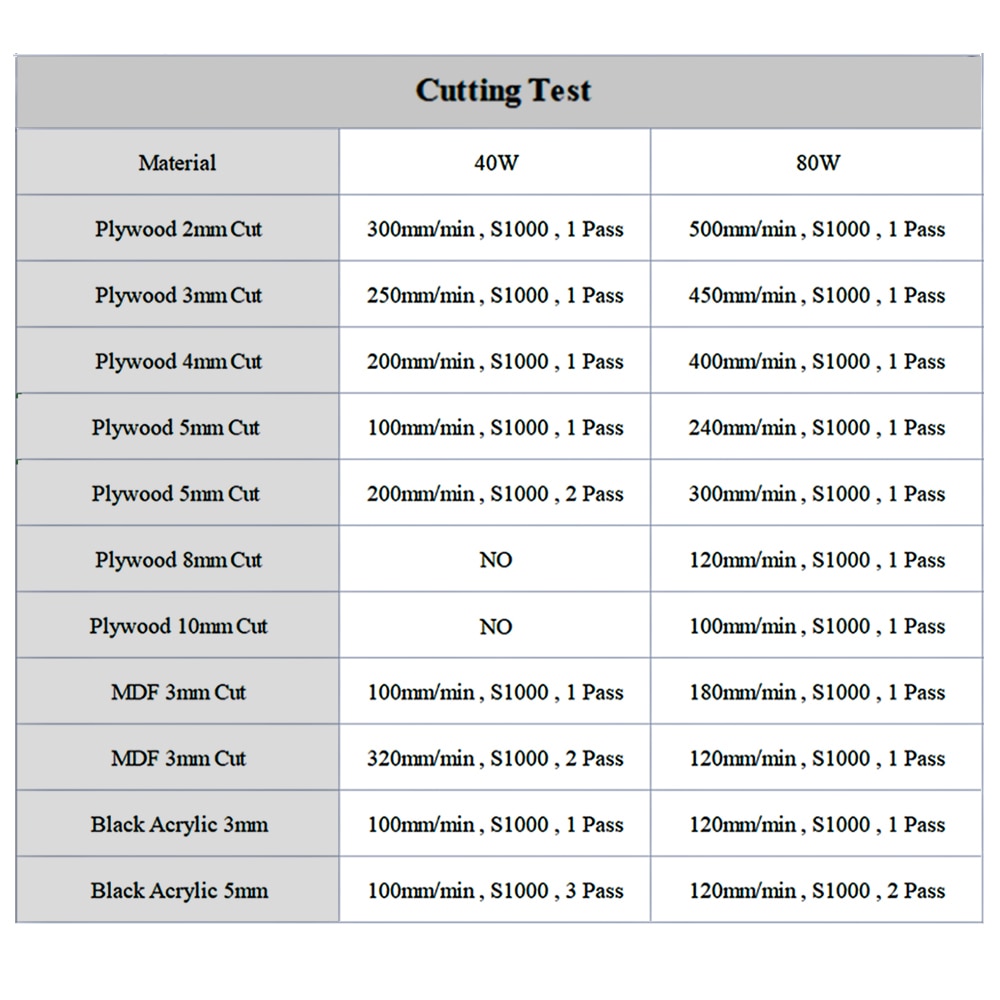 • Plywood 2mm cut  : 500mm/min , S1000 , 1 Pass