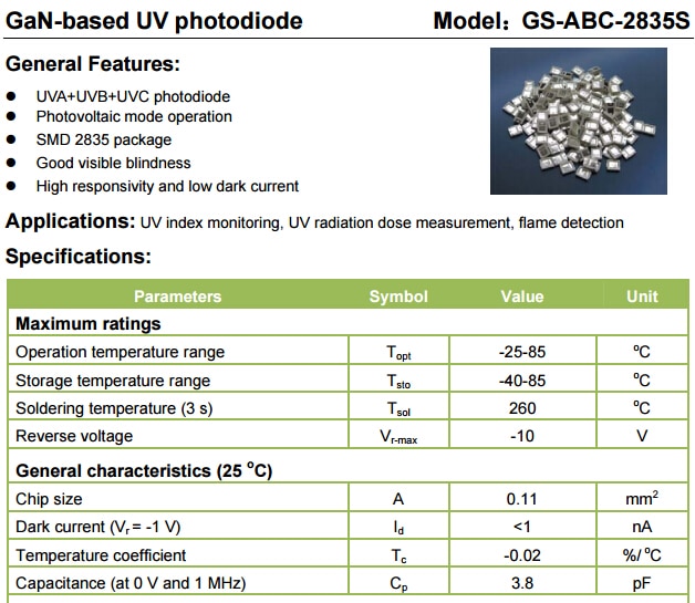 Fast Free Ship 10PCS/LOT For GaN-based UV photodiode GS-ABC-2835S Sunlight ultraviolet sensor UV sensor