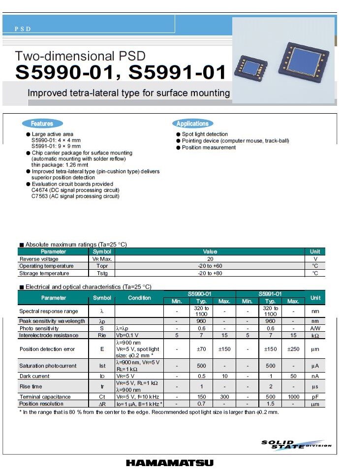 S5990-01 is a S5990 series two dimension, surface mount, high accuracy position sensitive detector (PSD). It has excellent position detectability. It is compatible with lead free solder reflow. It has a improved tetra-lateral type (pin-cushion type) delivers superior position detection. It is used in applications such as light spot detection, pointing device, various types of position detection.