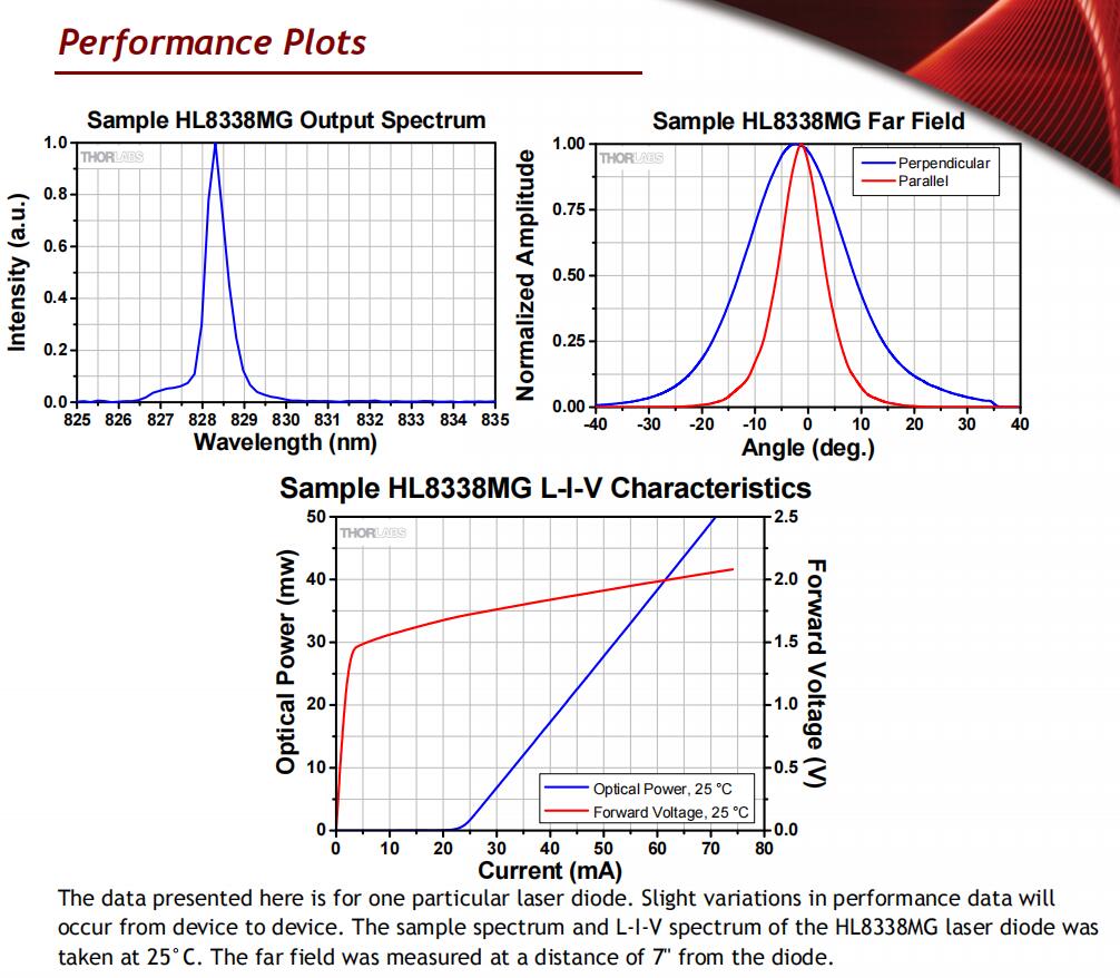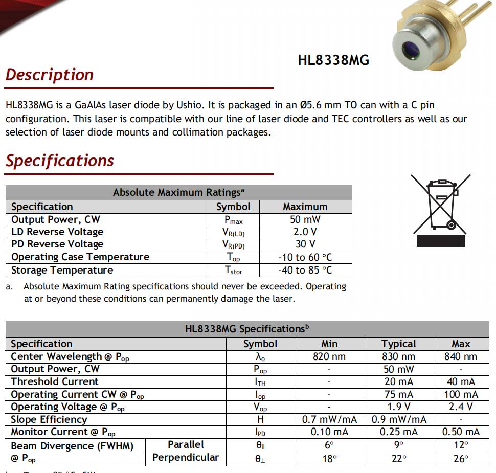 The HL8338MG from Ushio Inc. is a Laser Diode with Wavelength 820 to 840 nm, Output Power 0.05 W, Operating Voltage 1.9 to 2.4 V, Operating Current 75 to 100 mA, Threshold Current 20 to 40 mA. More details for HL8338MG can be seen below.