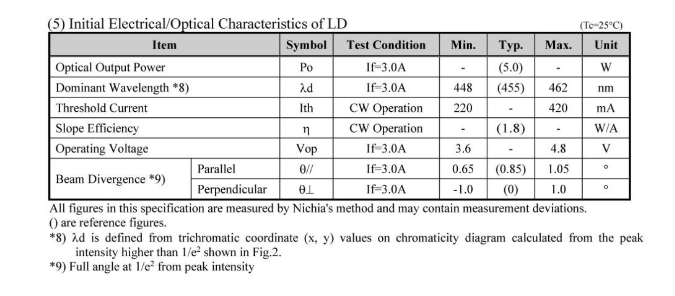 NICHIA NUBM49 φ9mm Blue 450nm 5.5W Laser Diode LD (Pulse 6.5W) for Cutting / Engraving   Certification: None Origin: JP(Origin) Item Type: Stage Lighting Effect Model Number: NUBM08 / NUBM49 Center wavelength: 450nm Output power: 5.5W Can Type/ Diameter: 9mm Operating current: Max 4.84A Operating voltage: 4.2V-4.7V Working life: More than 10,000H Operating temperature: 0 ~ 65 ℃ Storage temperature: -40 ~ 85 ℃ Model: NUBM08 Features: Brand:…