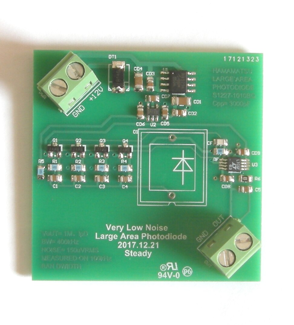 Ultra-low noise large-area photodiode amplifier (silicon photocell) with a drive capacitance of up to 4000pF, suitable for amplification of Hamason S1227-1010BQ or other similar compatible models of photodiodes, noise can be reduced to the original 1/ 10