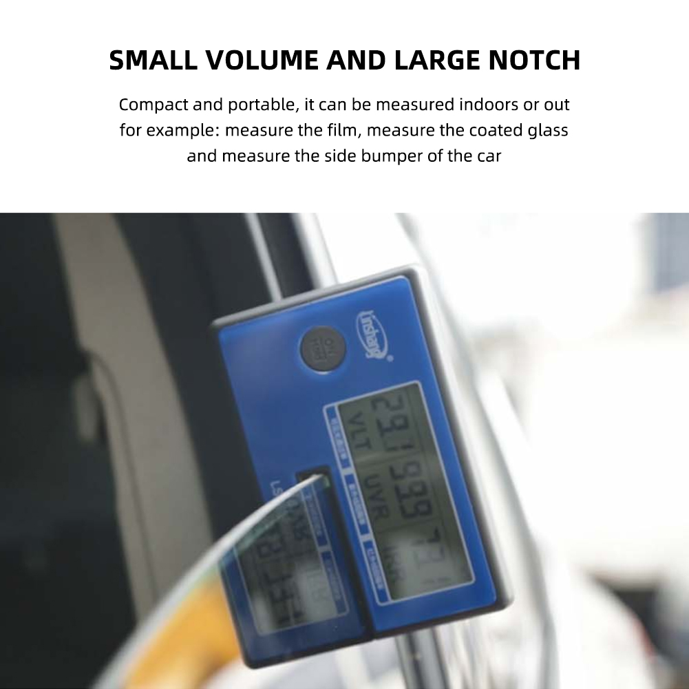 Compact and portable, it can be measured indoors or out for example: measure the film, measure the coated glass and measure the side bumper of the car